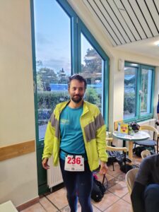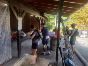 Es geht dann doch unter dem Haus der Weinstraße durch, allerdings ist dort nicht die Ziellinie, diese befindet sich am Sportgelände des TSV Bockenheim bzw. der Festhalle Emichsburg. Das Gelände kenne ich als Marathonmesse, aber die genaue Location des Ziels nicht, markiert ist auch weiterhin nichts – also weiterhin auf den Track schauen. Am Sportplatz steht dann auch endlich die ersehnte Beach-Flag zur Markierung, allerdings müssen wir noch bis in die Halle hinein und an den Tresen. Dort ist die offizielle Ziellinie. Geschafft! Ich beglückwünsche Stefan zu seiner Leistung und der steten Motivation, aber die Ehre ist ganz auf seiner Seite. Wären wir alleine gewesen wäre die Strecke viel eintöniger und wir wohl auch langsamer unterwegs gewesen. Am Ende sind es 9:48h und somit Platz 22 für mich, insgesamt waren 49 Teilnehmer am Start, angekommen sind 46. Mit einer Platzierung in der vorderen Hälfte hätte ich angesichts meines Trainings nicht gerechnet, aber es scheint ja doch nicht ganz falsch gewesen zu sein.