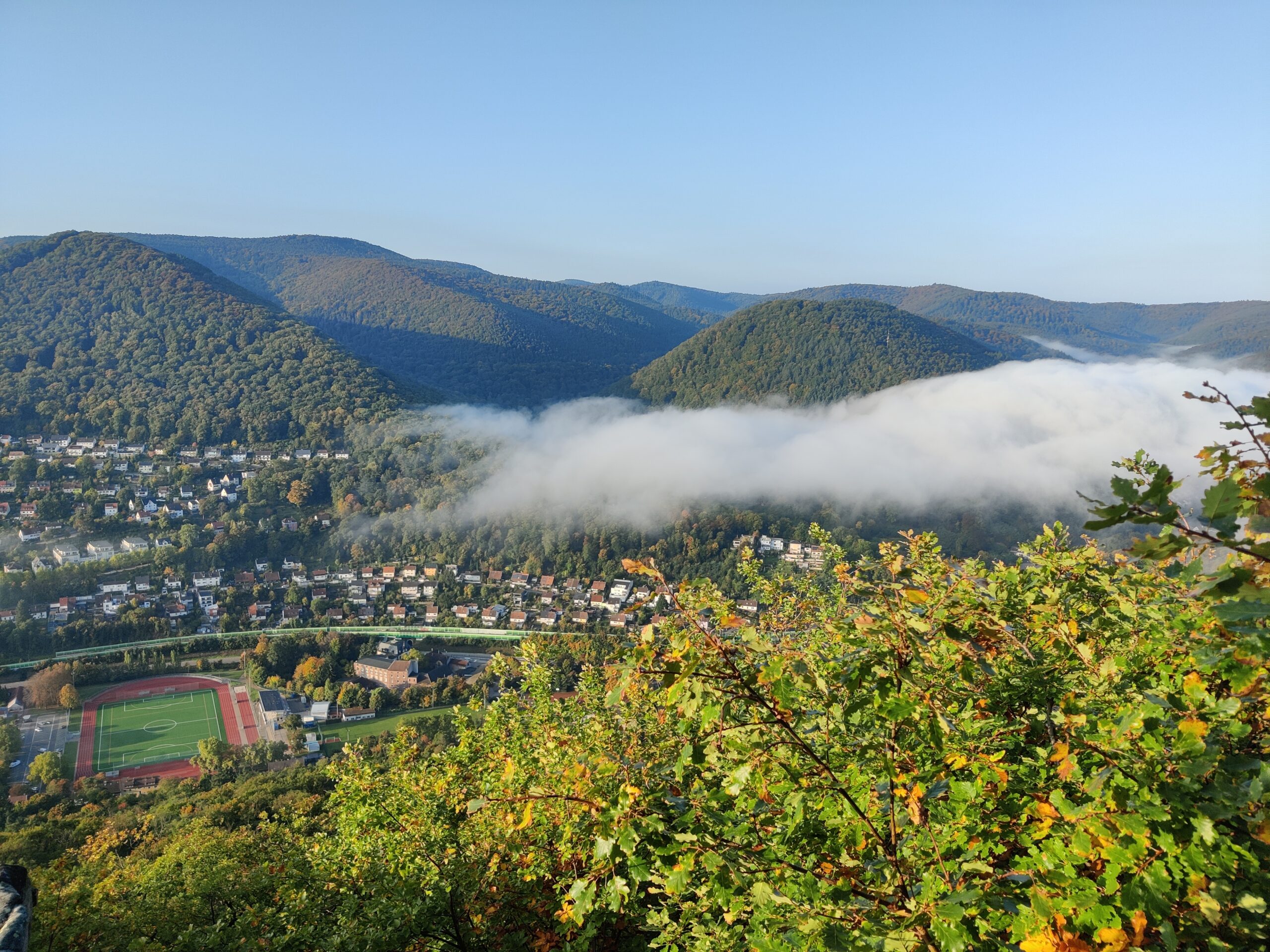 Am Ausblick Bergstein machen wir einen minimalen Foto-Stopp. Im Tal ziehen noch die Wolken, von oben scheint die goldene Oktober-Sonne. Es erinnert mich ganz deutlich an den Geburtstagsultra, nur bin ich diesmal auf der anderen Seite des Tals und in die entgegengesetzte Richtung unterwegs. Noch dazu ist mir natürlich bewusst: Der Trail geht diesmal bis zum Ende als Trail und nicht nach der Hälfte in einen flachen Lauf in der Ebene über. Die Wege sind aktuell vergleichsweise flach, aber das bleibt nicht lange so, wir halten recht direkt auf die erste Versorgung am Weinbiet zu. Bis zur Hütte geht es dann nochmal richtig steil nach oben, aber es stehen auch schon die ersten Unterstützer an der Strecke – mit Glocken und Schellen die man gefühlt schon einen Kilometer vor der Versorgung hört. Die Versorgung halte ich bewusst kurz, ein paar Gummibärchen, einen Riegel für den Weg und einen Schluck Iso. Schon geht es weiter, das Feld hat uns noch nicht wieder ganz überrollt.