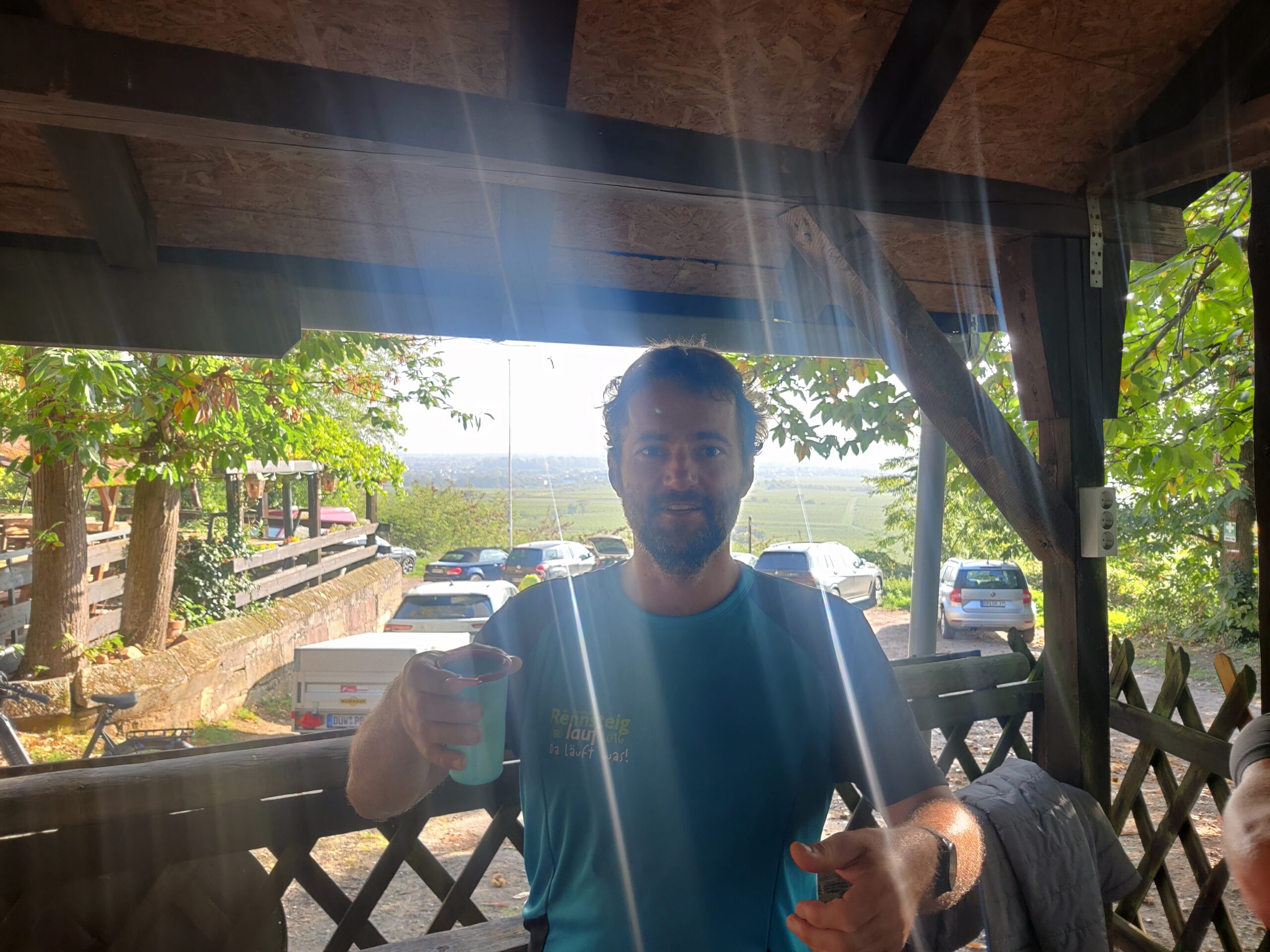 Immer wieder unterhalten wir uns auch ein wenig, wir kennen beide den Weinstraßen-Marathon von daher kennen wir auch die Ortschaften die wir sehen doch zumindest einmal vom Durchlaufen. Insgesamt gibt uns das auch etwas Orientierung. Der Anstieg in Neuleinigen hat es nochmal gut in sich und hört auch nach dem Ort nicht so recht auf. Wir unterqueren die A6. In der Ferne sehen wir schon ein großes Weingut mit einer gigantischen Dartscheibe, kurz darauf laufen wir daran vorbei, das ist doch noch nicht die Versorgung. Die folgt aber wenige hundert Meter später am Sportlerheim. Meine Trinkblase ist komplett leer, gut dass ich auffüllen kann. Zudem noch ein paar Happen: Riegel, etwas Obst und für mich auch wieder jede Menge Gummibärchen. Beim Loslaufen habe ich eine kleine technische Panne – der Verschluss der Trinkblase ist nicht ganz richtig zu und so schwappt mir eine größere Menge Wasser in den Rücken und läuft die Beine hinunter – Erinnerungen an Angkor Wat inklusive, dort war das Leck etwas schleichender und vor allem das Wetter deutlich wärmer. Also einmal Deckel richtig drauf und dann weiter laufen – Stefan ist schon ein gutes Stück voraus aber an einem Abzweig spurtet er dann doch vorbei – meine Uhr gibt mir deutlich früher Bescheid und so laufen wir dann wieder gemeinsam weiter.