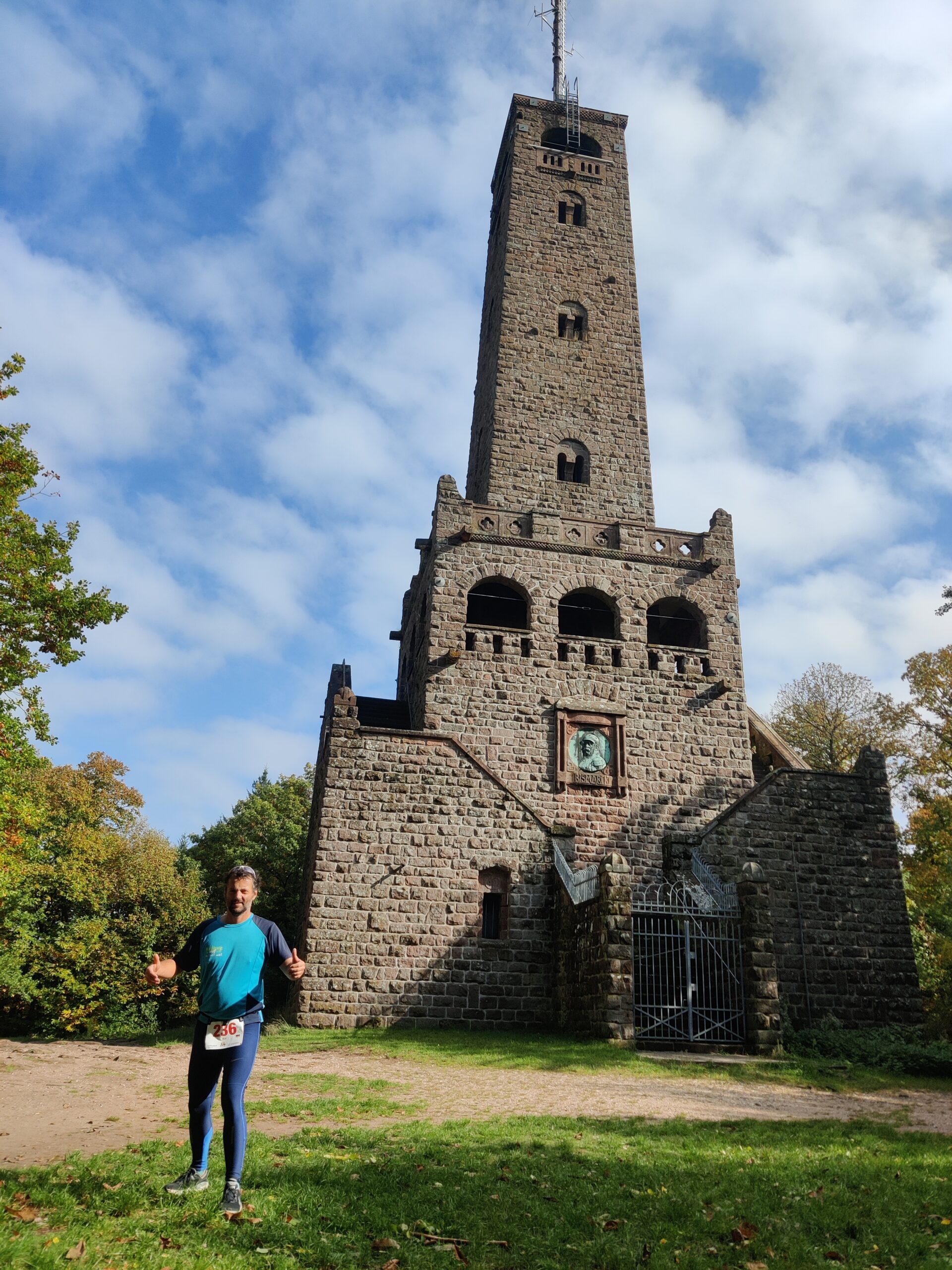 Die Forstarbeiten sind klar ausgeschildert, der Track zweigt wie angekündigt nun vom Weinsteig ab. Nun heißt es für mich: Ganz besonders auf den Track achten, denn zusätzliche Markierungen gibt es ja nicht. Nur eines ist klar: Es geht weiterhin bergauf. Es zieht sich etwas bis ich die Kuppe des Peterskopfs mit dem Bismarckturm erreiche – dort findet sich praktischerweise ein Familie die mir ein Beweis-Foto macht. Man unterhält sich kurz und ist doch sehr erstaunt was die Läufer bis hierhin schon an Strecke zurück gelegt haben. Auch mit einem Mythos räumen wir auf: Marathon ist definitiv nicht die längste Strecke die gelaufen wird und der Weinsteig ist auch eher „Mittelfeld“ was die Länge betrifft, insbesondere wenn man wie ich „nur den Tiny“ läuft.