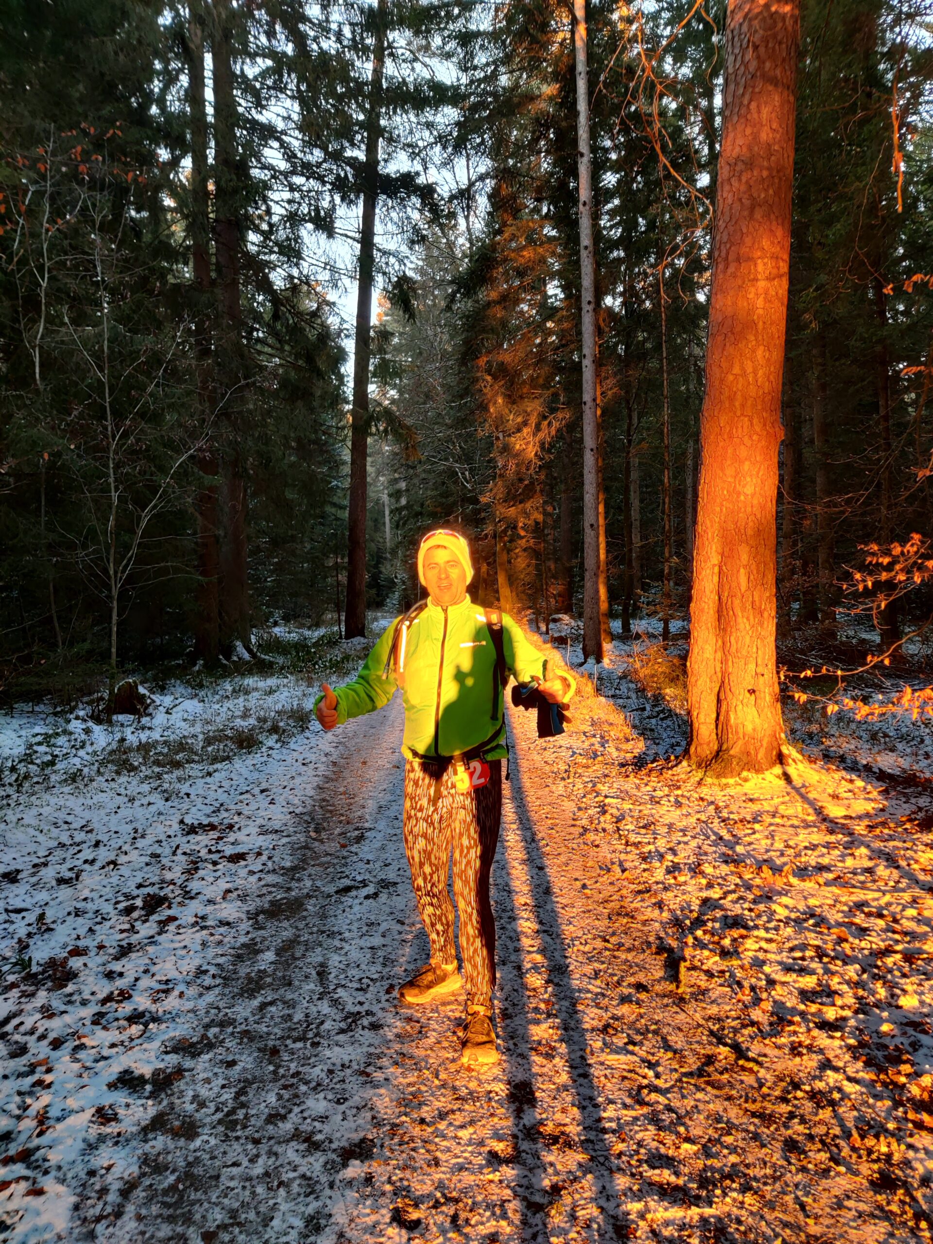An der nächsten Steigung, fast direkt nach dem Viadukt schlägt denn auch die erste Stunde des alten Ultra-Hasen: es geht verdammt steil bergan, zu steil als dass ich es joggen möchte, rein schon wegen der dazu notwendigen Energie. Also schalte ich ganz routiniert einen Gang zurück und marschiere den Anstieg nach oben. Falco ist zwar im ersten Moment etwas überrascht, marschiert dann aber ebenfalls zügig die Steigung nach oben. Ab dem Sportplatz wird es wieder flacher und wir laufen wieder an. Da das Licht gerade wunderschön auf den Winterwald schneit machen wir noch ein paar Bilder – auf die wenigen Minuten extra kommt es heute und beim Ultra ja nicht wirklich an. War der erste Streckenanteil größtenteils durch Siedlungen und Felder geprägt so führt der folgende Abschnitt nun ausschließlich durch den winterlichen Wald. Dabei geht es ganz sachte aber ohne Unterlass bergan – ich kann hier auf mein Sommertraining im Exotenwald bei Weinheim bauen – auch die dortige Strecke zieht sich über viele Kilometer mit einer ganz leichten Steigung (und einem dicken Ende) nach oben. Die Strecke ist weiterhin vorbildlich markiert und so kann man an den wenigen fraglichen Abzweigungen gar nicht falsch laufen.