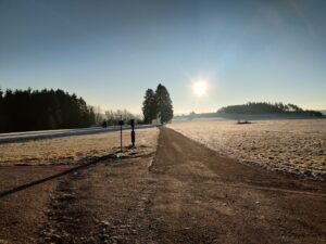 Durch den Wald ist es nun echt anstrengend und die Steigung will scheints gar kein Ende nehmen – gut, dass es einige markante Abzweigungen gibt an denen man sich orientieren kann – es sind noch rund 7km bis ins Ziel. Im Kopf überschlage ich, dass wir nun also noch etwas mehr als drei Kilometer bergan laufen werden bevor es erst etwas flacher wird und etwas später dann auch bergab geht. Nun geht der Blick etwas häufiger auf die GPS-Uhr: es geht bergab und es sind nur noch drei Kilometer – allerdings sind wir immer noch im Wald unterwegs. Stellenweise gefriert wieder fest was mit den Sonnenstrahlen angetaut wurde – entsprechend rutschig sind jetzt viele Stellen. Jetzt ein Sturz wäre sehr unangenehm und vor allem ärgerlich. Kurz vor dem Waldrand sind es dann nur noch zwei Kilometer – entsprechend der Nähe zum Ziel hat sich unsere Pace nochmal deutlich gesteigert – wir sind deutlich unter 6 min/km unterwegs, zwischenzeitlich lese ich 5:40 min/km ab. Durch die Felder auf den geräumten Wegen läuft es sich aber natürlich auch nochmal deutlich leichter. Falco macht nochmal richtig Druck vom Tempo her, da muss ich mich schon ranhalten.