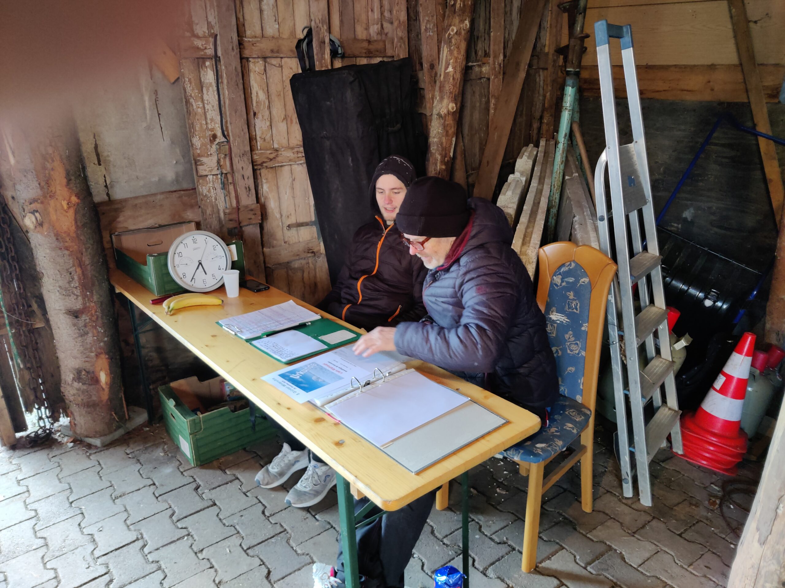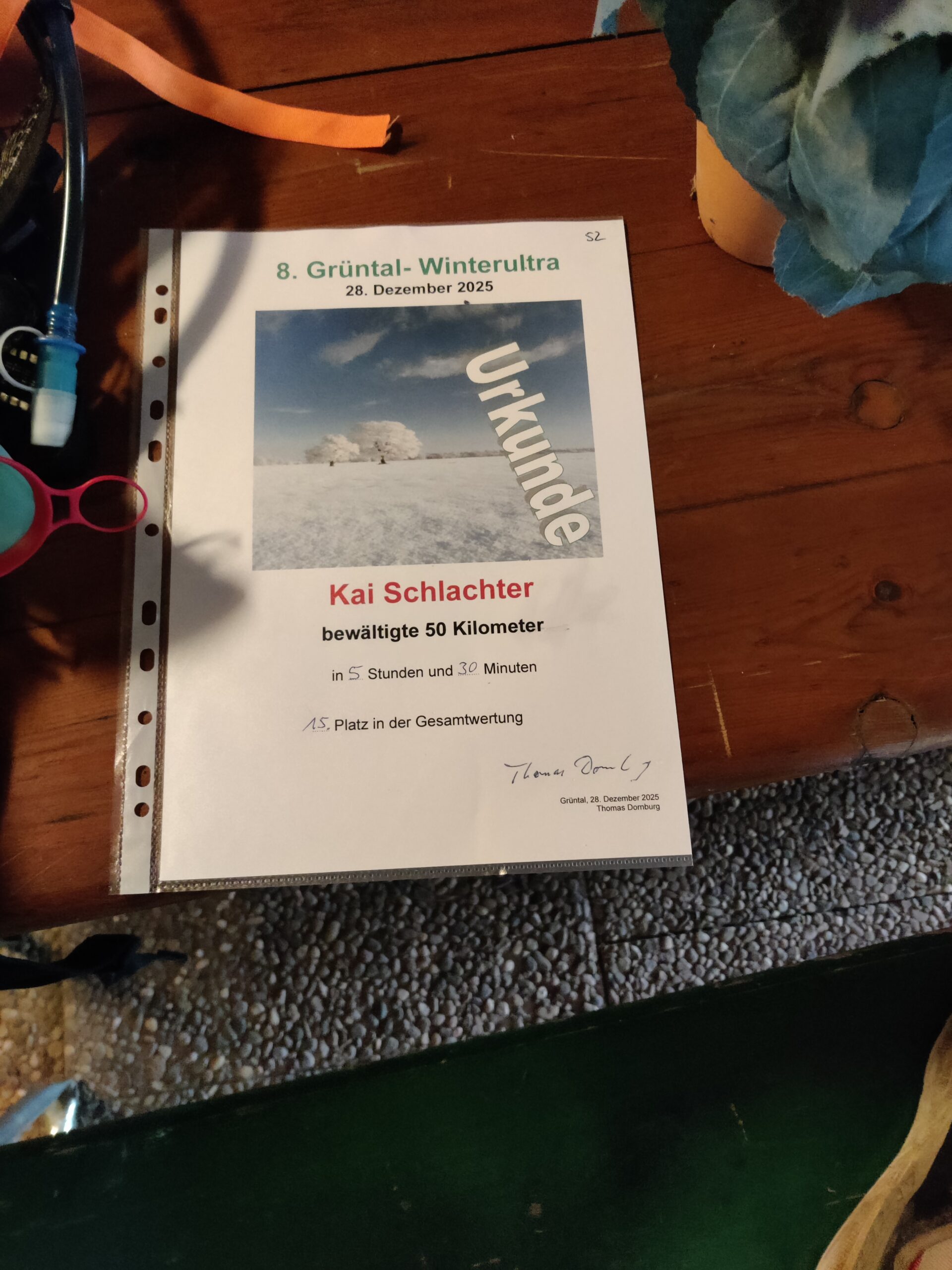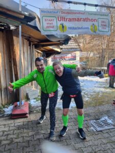 Die nächste Ansage: noch 1km. Der kleine giftige Anstieg vor Grüntal wird jetzt mit Kraft hochgejoggt, es ist ja nicht mehr weit. Mit Beginn der Bebauung sind es noch 700m. Rund 300m vor dem Ziel lässt Falco mir dann eindeutig den Vortritt, auch wenn ich das eigentlich nicht für nötig halte. Am Ende gehen wir ohnehin fast im Gleichschritt über die Ziellinie in Thomas Hof hinein. Wir haben sogar noch eine unerwartete Punktlandung erreicht: exakt 5:30h brutto waren wir unterwegs – Wahnsinn, dass wir das noch geschafft haben – zwischenzeitlich sah es schon eher nach 5:40h aus. Im Ziel natürlich großes Beglückwünschen und Bedanken bevor wir uns über die diversen Leckereiein hermachen: Schokolade, Kekse und vor allem warme Maultaschen in Brühe – absolut top was das alles aufgefahren wurde. Zudem machen wir noch einige Bilder und es gibt natürlich auch noch Urkunden. Wir haben beide zeitgleich den 15. Platz erreicht – zu diesem Zeitpunkt waren schon drei Läufer ausgestiegen, aber wir sind dennoch im vorderen Drittel gelandet. Das hätte ich so nicht geplant und erwartet, ist aber natürlich ein toller Abschluss für dieses Jahr.