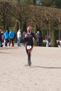 Ankommen ist jetzt auf alle Fälle drin und ich bereite mich innerlich ein wenig auf einen Endspurt vor, auch wenn die Energie dafür eigentlich nicht so ganz vorhanden ist. Ich schwenke auf die letzte Schleife durch den Schlossgarten ein: dort stehen dann auch nochmal Schilder, noch 1km liegt ungefähr vor mir – grob einmal den Park hoch und wieder runter. Das Feld um mich herum ist wieder etwas dichter geworden, aber es lässt sich noch sehr gut laufen. Ich kann sogar noch einige Läufer einholen – meine Ultra-Erfahrung macht sich hier doch positiv bemerkbar was die Ausdauerleistung betrifft. Es geht auf Zentralachse, noch 500m bis zum Ziel am Neptunbrunnen. Ich nehme die Beine in die Hand, insbesondere als ein anderer Läufer hinter mir ebenfalls versucht noch einen Platz gut zu machen. Der Auslauf im Ziel ist leider nur minimal, etwas mehr Meter zum „runterbremsen“ wären mir da recht gewesen, der abrupte Stop bekommt mir nicht so ganz. Laut Uhr bin ich knapp unter 46 Minuten, die 45er Marke verfehle ich nur ganz knapp. Netto sind es 45:38, somit Platz 82 gesamt, 75 bei den Männern und Platz 24 in der Altersklasse. Angesichts des Trainings muss ich da echt zufrieden sein, was praktisch aus dem Stand heraus so möglich war. Die Synchronisation mit der Familie auch noch auf Platz 22 in der AK zu kommen habe ich knapp verfehlt, rund 30 Sekunden schneller hätte ich sein müssen.