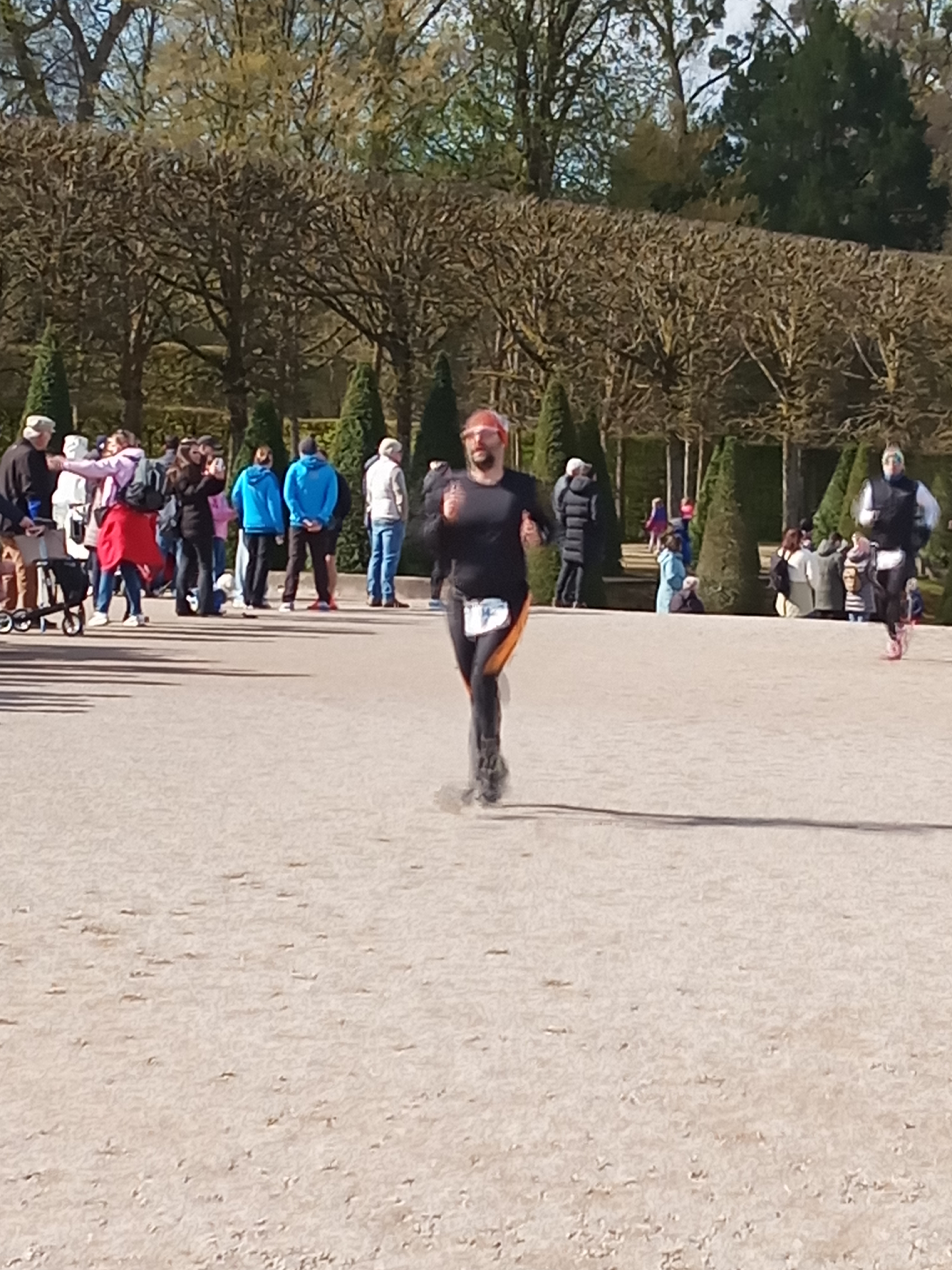 Es geht um Ketsch herum und wieder über Autobahn und Bahntrasse – die Höhenmeter mit Kurven merke ich recht deutlich in den Beinen. Die Pace ist immer noch recht hoch, selbst in der Steigung lese ich nur wenig mehr als 5:00 min/km ab. Nach der Brücke ist aber auch das Allermeiste an Höhenmetern geschafft – von einigen sanften Wellen einmal abgesehen. An der Wasserstation bei ungefähr Kilometer 7,5km greife ich nochmal einen Becher Flüssigkeit ab – leider echt kalt, das schlägt mir ein wenig auf den Magen. Ich merke auch langsam, dass es etwas an die Substanz geht aber das Ziel im Schloss kann man schon kurz sehen. Davor sind aber noch ein paar Schleifen eingebaut – irgendwo müssen die verblieben 2km ja noch untergebracht werden.